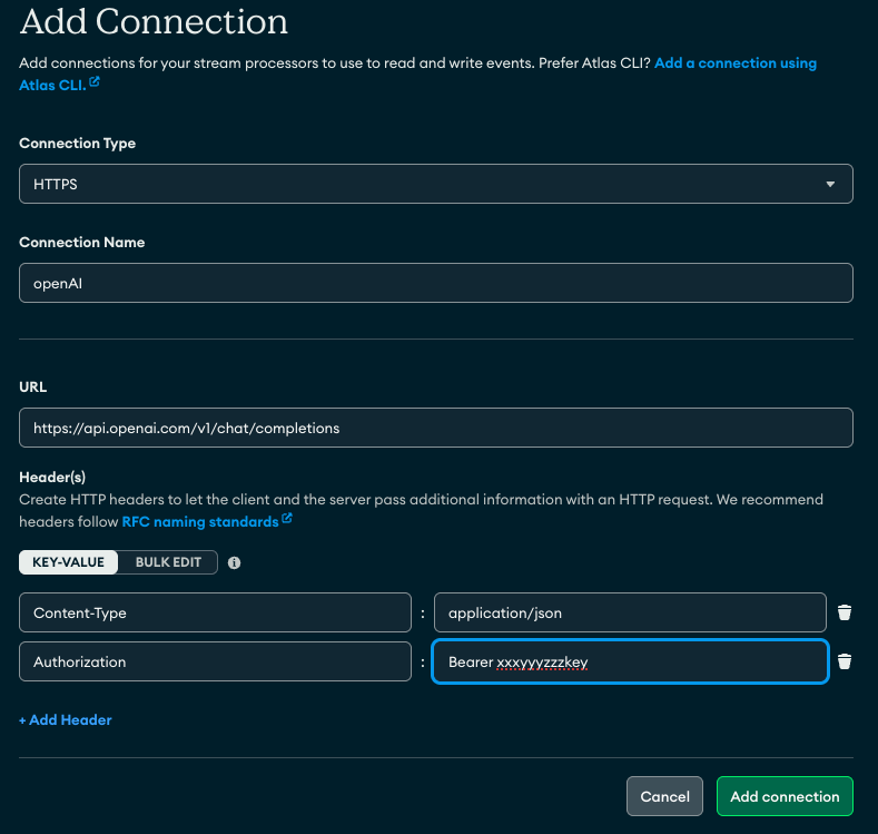 There are two main steps to achieving this — one is to create the connection registry for the sources and sinks required. One for the Kafka topic, one for the database we write to, but also one for the https endpoint for the OpenAI API. You can use the Atlas CLI/API or just use the Atlas UI by clicking on StreamProcessing- «instance»-Connections and add a new connection. It will look something like this:
